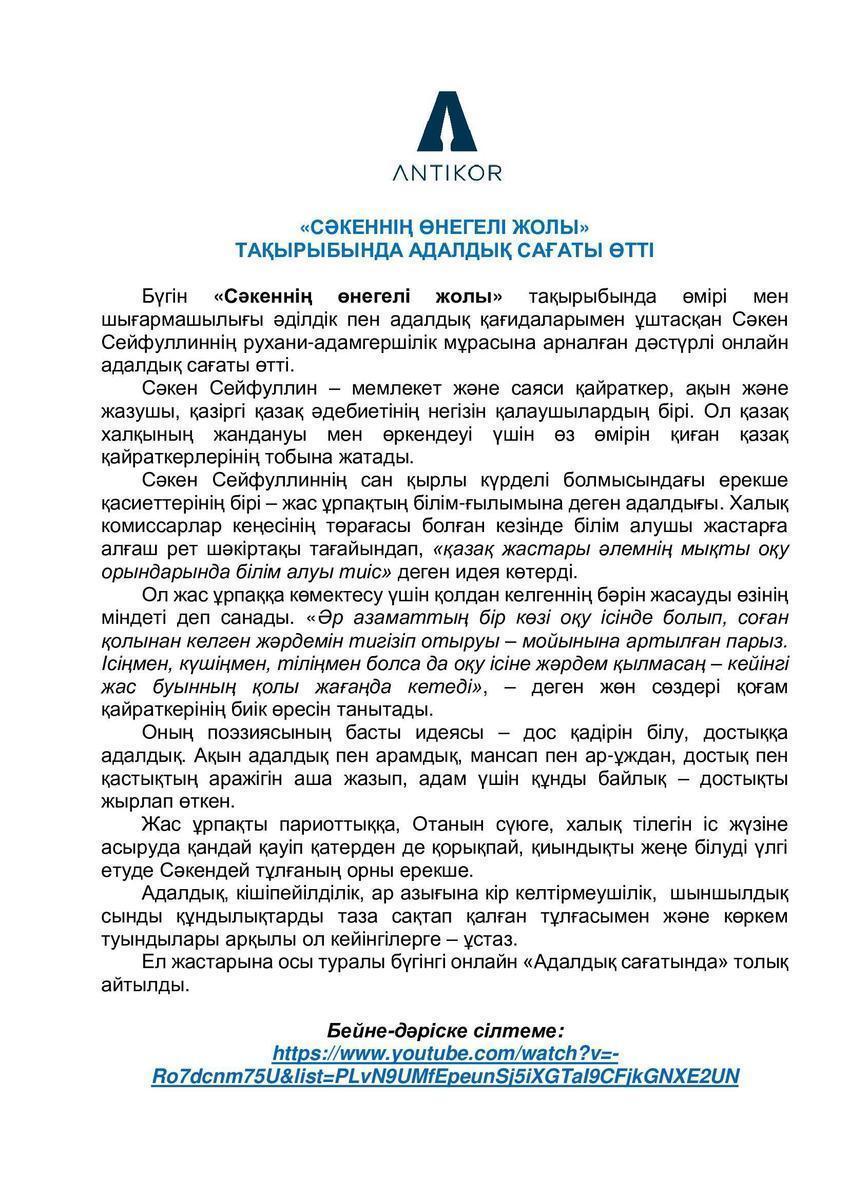15 желтоқсан 2020 0 1 2 3 4 5 «СӘКЕННІҢ ӨНЕГЕЛІ ЖОЛЫ» ТАҚЫРЫБЫНДА АДАЛДЫҚ САҒАТЫ ӨТТІ Осы беттің QR-коды:QR-код этой страницы: