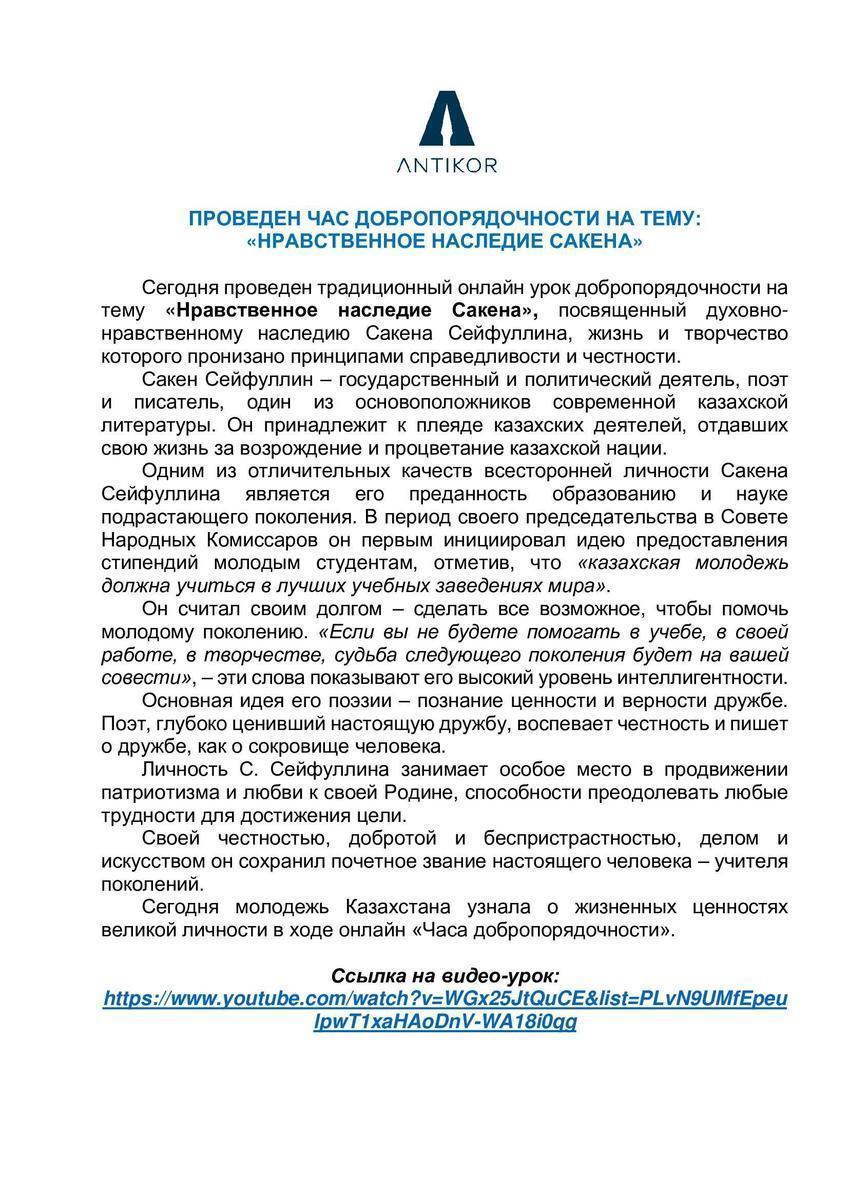 15 желтоқсан 2020 0 1 2 3 4 5 ПРОВЕДЕН ЧАС ДОБРОПОРЯДОЧНОСТИ НА ТЕМУ: «НРАВСТВЕННОЕ НАСЛЕДИЕ САКЕНА» Осы беттің QR-коды:QR-код этой страницы: