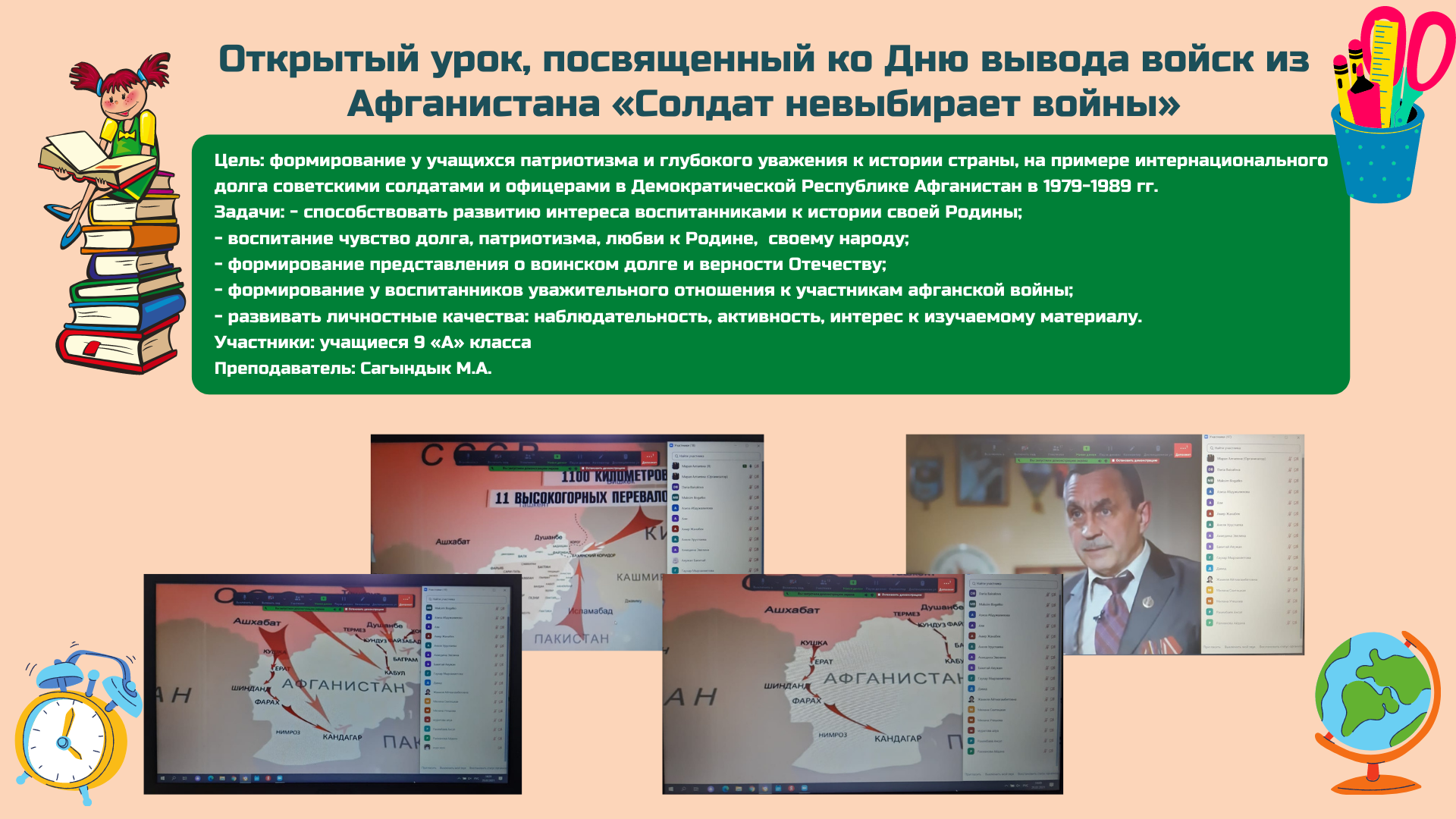 26 ақпан 2021 0 1 2 3 4 5 Открытый урок, посвященный ко Дню вывода войск из Афганистана «Солдат невыбирает войны» Осы беттің QR-коды:QR-код этой страницы: