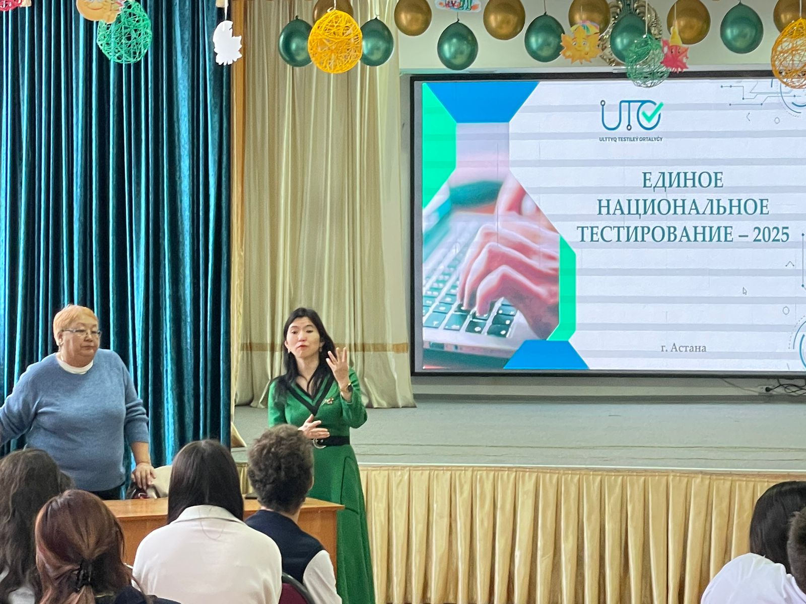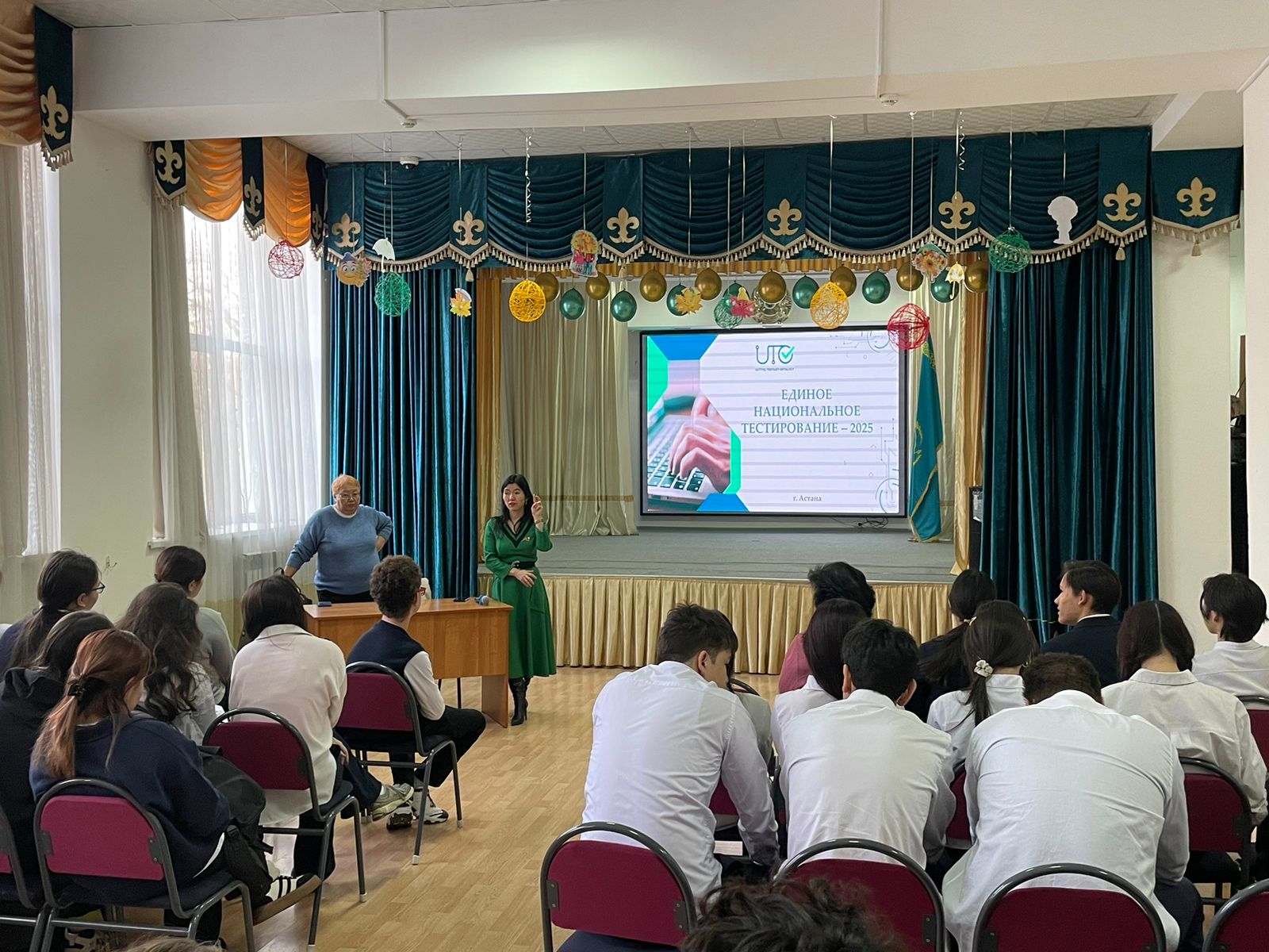 Түлектерді ҰБТ-ға дайындау мақсатында 11 сынып оқушыларымен Әл-Фараби атындағы ҚазҰУ өкілі Нұрсұлу Мейрамбекқызы Әлібиевамен және шет тілдері кафедрасының оқытушысымен кездесу ұйымдастырылды. Кездесу барысында мектеп түлектеріне ҰБТ тапсыру мерзімдері, қажетті құжаттарды дайындау, сондай-ақ оқушылар үшін ұсынылатын жағдайлар мен артықшылықтар туралы толық ақпарат берілді.