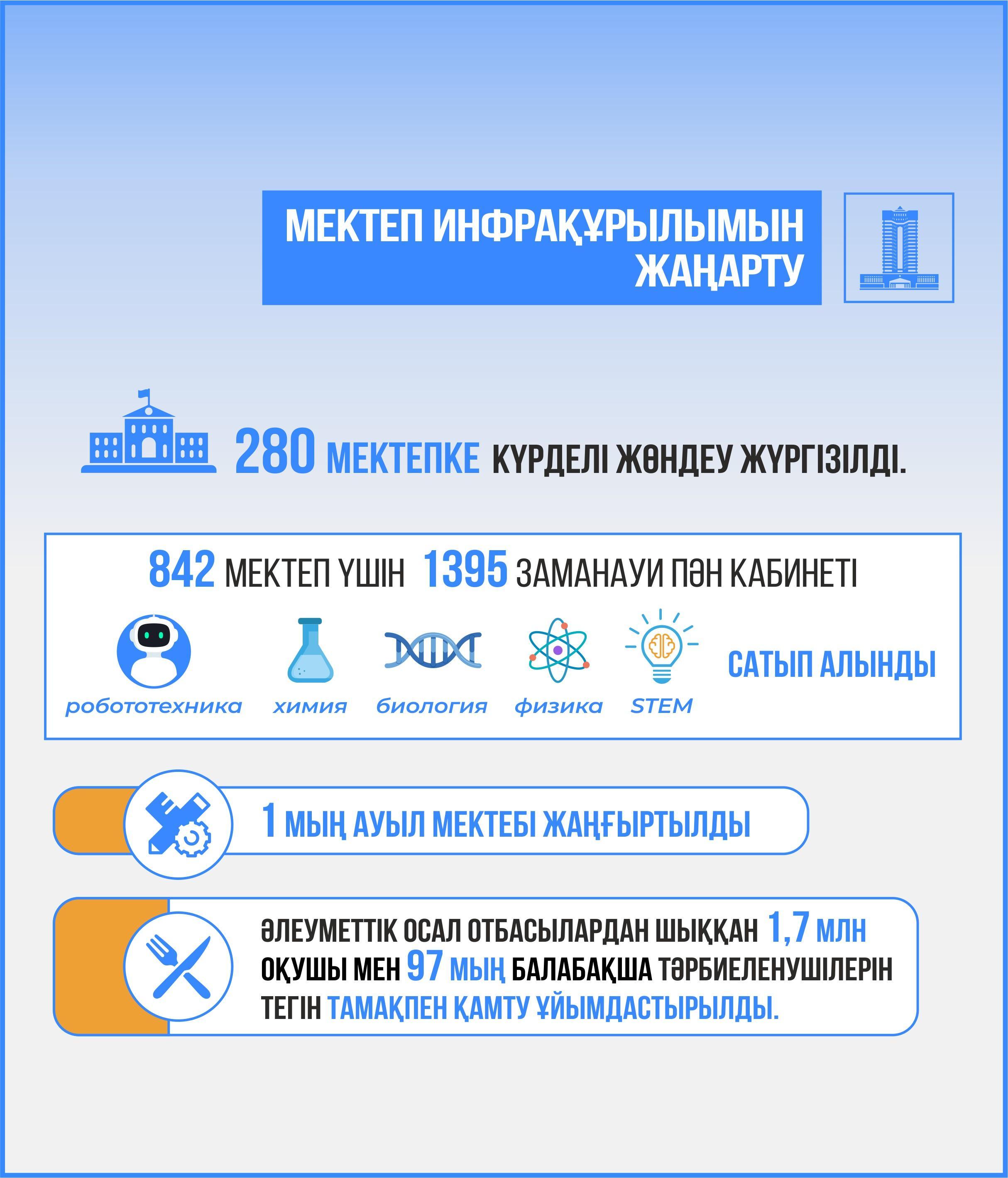 Бұрын-соңды болмаған мектеп салу шаралары үш ауысыммен байланысты проблемаларды айтарлықтай қысқартты. Бүгінде елімізде 3 мыңға жуық мектеп бір ауысымда жұмыс істейді. Сонымен қатар 254 орта оқу орны күрделі жөндеуден өтті, 967 мектеп үшін 1621 заманауи пәндік кабинет (робототехника, химия, биология, физика, STEM) сатып алынды. 1 мың ауылдық мектеп жаңғыртылды. 10 мыңнан астам білім беру ұйымдарының қауіпсіздік жүйелерімен техникалық жарақтандырылуы арттырылды.