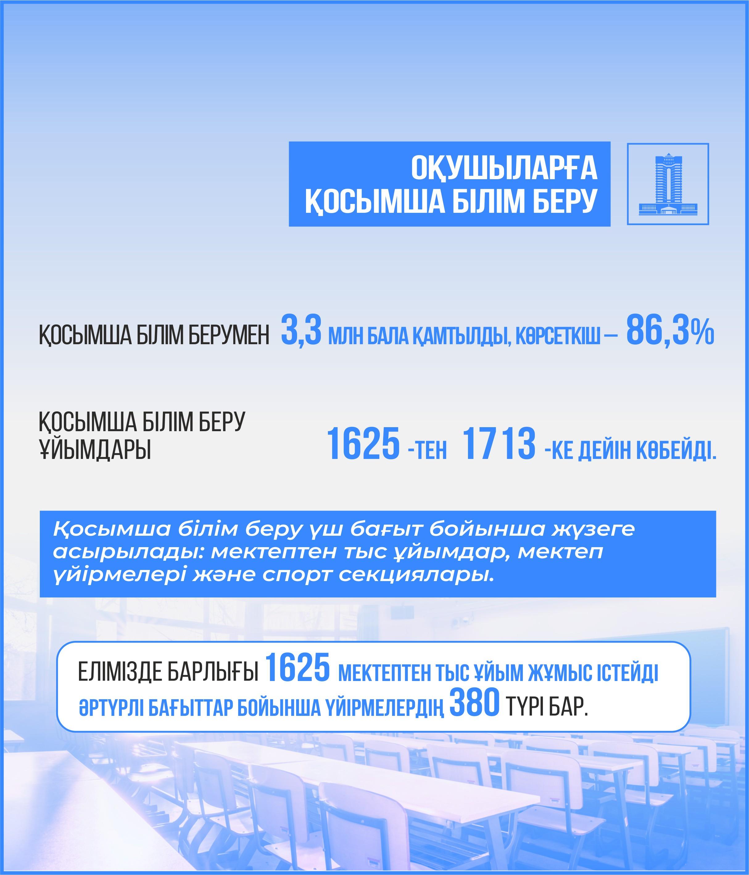 Президент балалардың шығармашылық пен қолөнердің қыр-сырын меңгеруі үшін балалар үйірмелерінің жұмысын қалпына келтіру міндетін қойды. Биылғы жылы балаларды қосымша біліммен қамту 86,3%-ға дейін өсті – бұл 3,3 млн бала, ал қосымша білім беру ұйымдарының желісі 1625-тен 1713-ке дейін артты. Жалпы, қосымша білім беру үш бағытта жүзеге асырылады: мектептен тыс ұйымдар, мектеп үйірмелері мен спорт секциялары. Елімізде барлығы 1625 мектептен тыс ұйым бар және әртүрлі бағыттағы 380 үйірме түрі ұсынылады.