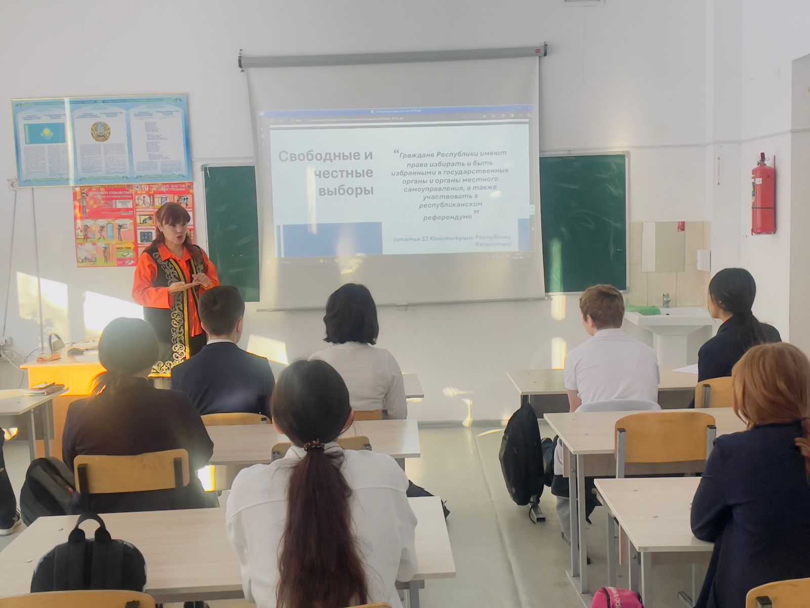 Оқушылар сайлау жүйесінің маңызы, азаматтық құқықтар мен сайлаудың қоғамдағы рөлі туралы жан-жақты ақпарат алды. Сабақ мемлекеттік және орыс тілдерінде әзірленген материалдар негізінде өтті.