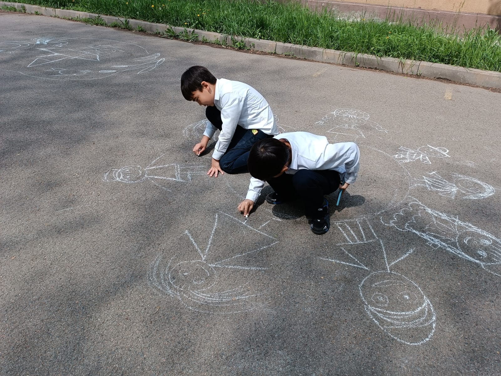 🎨 Бейнелеу өнері пәні мұғалімдерінің жетекшілігімен 1–2 сынып оқушылары өздерінің Отанына деген сүйіспеншілігін, достық пен татулықты түрлі-түсті бояулармен жеткізді. Асфальт бетінде күн шуағы, туымыз, гүлдер мен бейбітшілік нышандары бейнеленді.