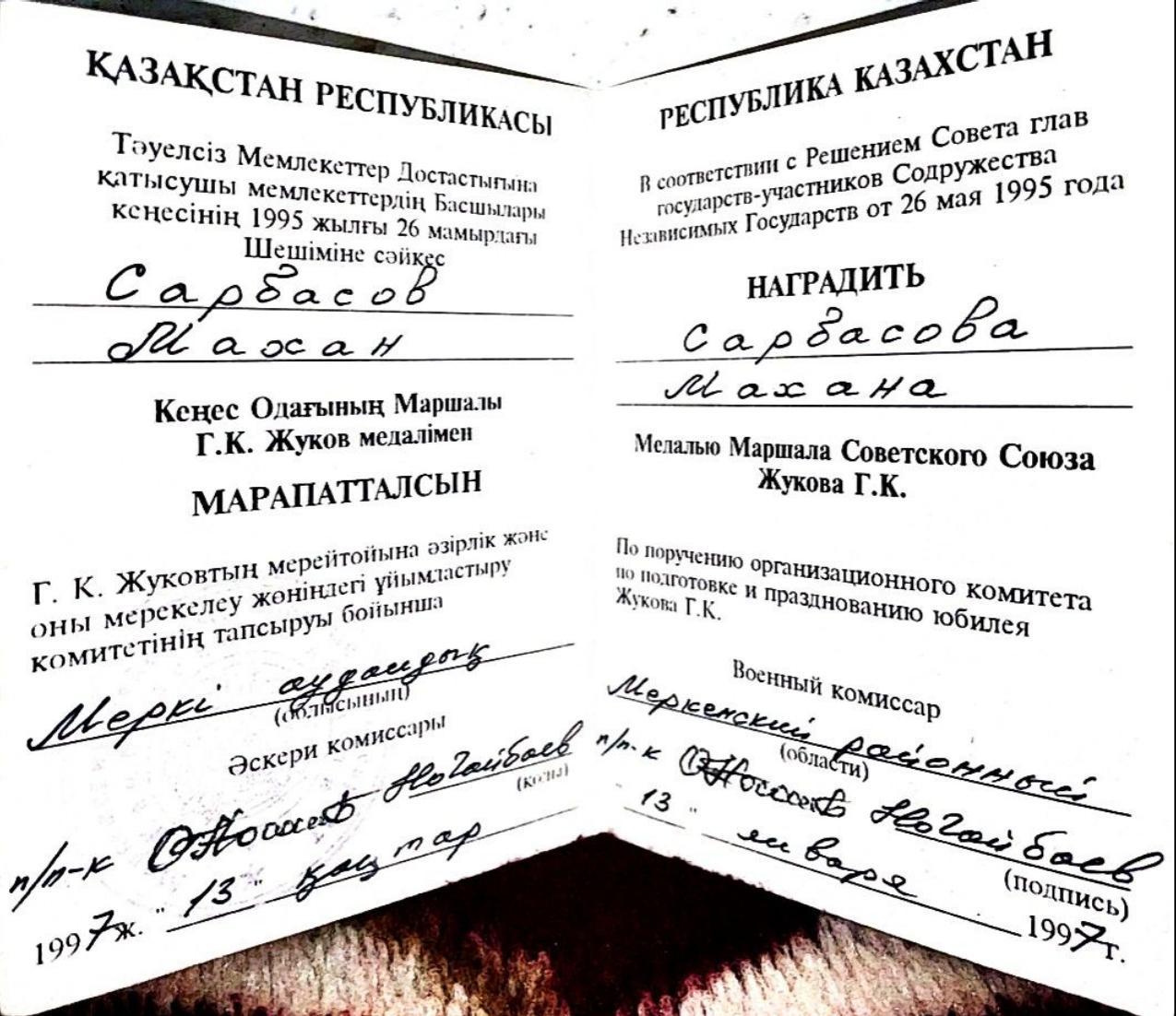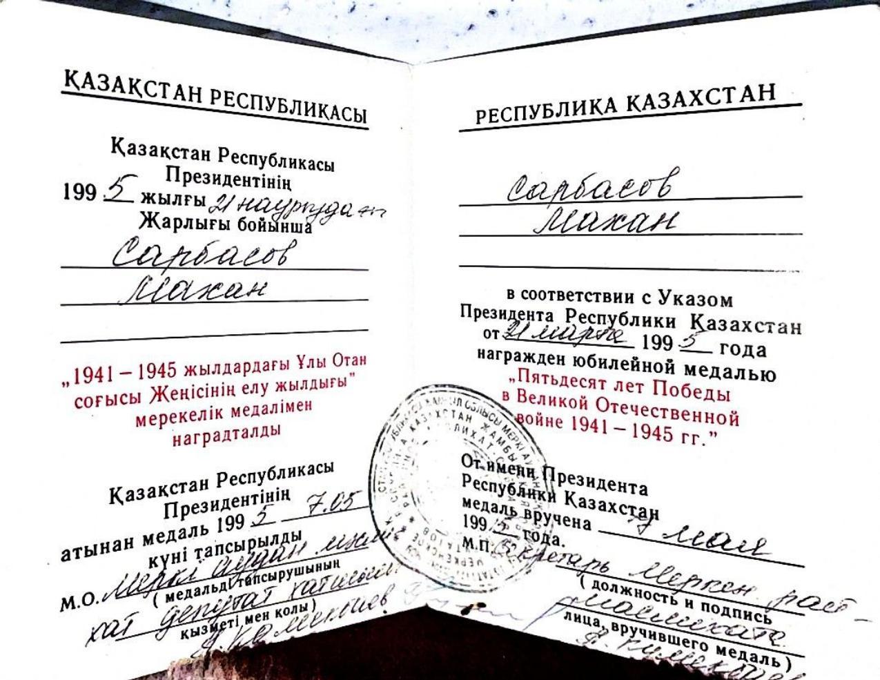 Мой дедушка, Сарбасов Махан, родился в 1924 году в селе Екпинди в крестьянской семье. С раннего возраста он начал работать, помогая своей семье. В 1945 году он женился на моей бабушке, Акмолдаевой Сейсекуль, и вместе они воспитали восемь детей.