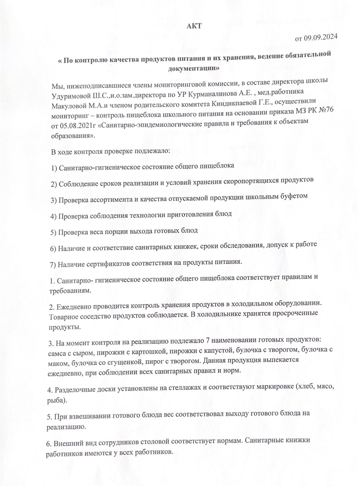 09 қыркүйек 2024 0 1 2 3 4 5 "Тамақтану сапасын бақылау және оларды сақтау" акті / АКТ "По контролю качества питания и их хранению" Осы беттің QR-коды:QR-код этой страницы: