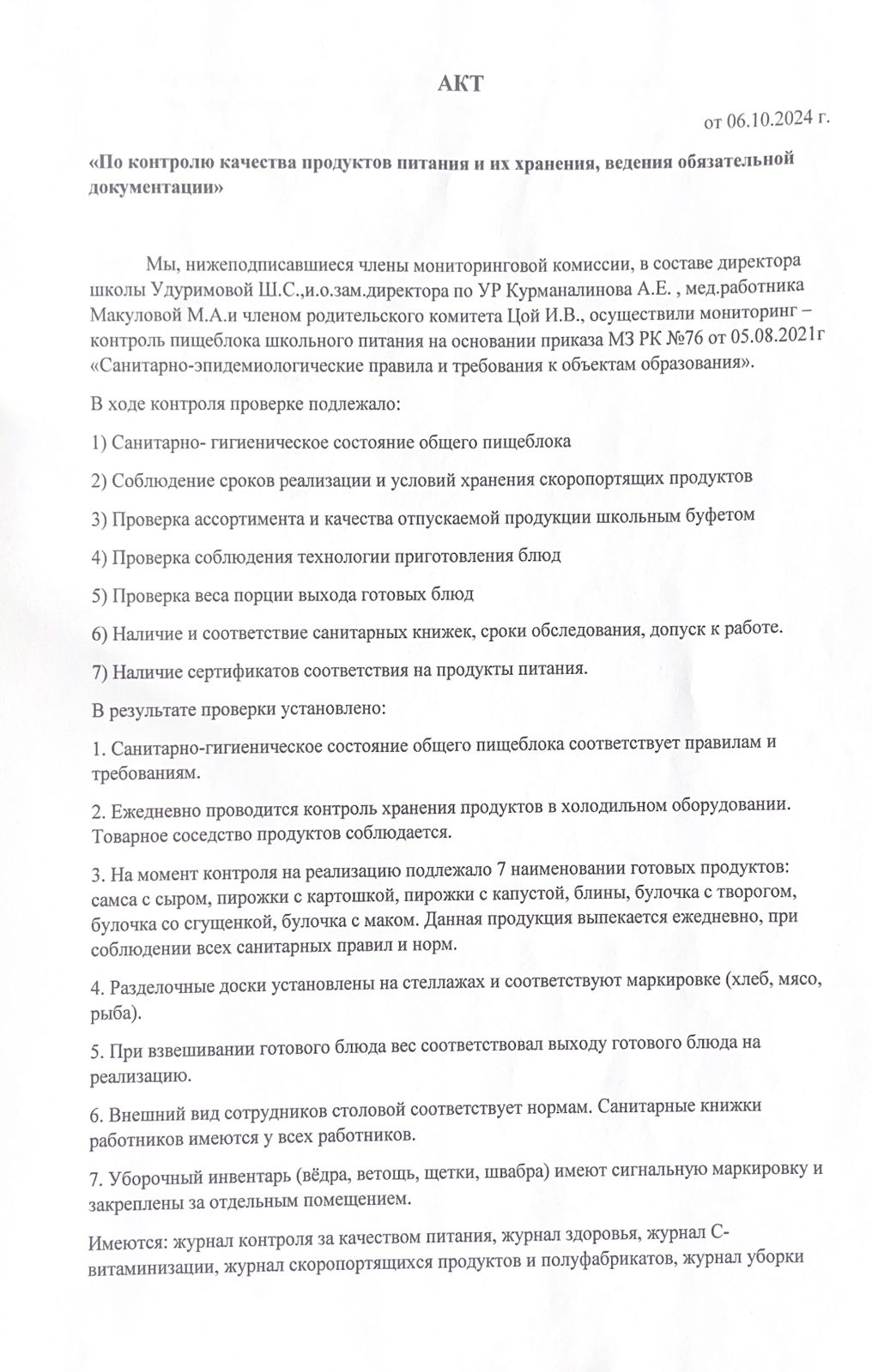 06 қазан 2024 0 1 2 3 4 5 "Тамақ өнімдерінің сапасын бақылау және оларды сақтау" акті / Акт "По контролю качества продуктов питания и их хранения" Осы беттің QR-коды:QR-код этой страницы: